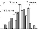 Табл. 2 свидетельствует, что межрегиональные взаимодействия цен имеют высокую интенсивность: в среднем ценовые возмущения переносятся между данным регионом и 46 другими (62% от их общего числа). Эта величина колеблется по регионам от 26 (35%) до 65 регионов (88%). Устойчивая при разном числе лагов группа регионов со слабыми ценовыми связями с остальной частью страны включает Иркутскую и Владимирскую области. В группу с наиболее интенсивными связями входят Республика Саха (Якутия), Саратовская и Оренбургская области.