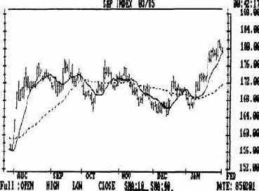 Рис. 9.9а Примеры применения средних скользящих, построенных на основе некоторых чисел Фибоначчи. Точечная, недавно пересеченная линия - стосорокачетырехдневное среднее скользящее. Она является эквивалентом тридцатинедельного среднего скользящего. Кроме того, на графике представлены тринадцати- и тридцатичетырехдневная кривые. Тринадцатидневное среднее скользящее (сплошная линия), поднимаясь, пересекло тридцатичетырехдневное (пунктирная линия), при этом возник сигнал к покупке.