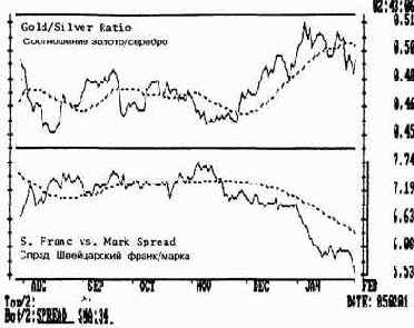 Рис. 9.12a Пример двадцатиоднодневного среднего скользящего применительно к графику соотношения золото/серебро (вверху). Внизу- тридцатичетырехдневное среднее скользящее на графике спрэда между швейцарским франком и немецкой маркой.