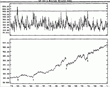 Всякий раз, когда скользящее среднее АВI превышало уровень 450, происходили мощные подъемы рынка.