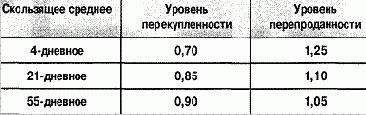 Конкретные значения уровней «крайней» перекупленности или перепроданности зависят от длины скользящего среднего, используемого для сглаживания индикатора, и от состояния рынка. В таблице представлены типичные значения для уровней перекупленности и перепроданности.