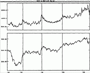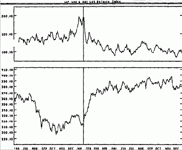 На следующем рисунке показаны графики индекса S&Р 500 (нижнее окно) и 10 дневного скользящего среднего индекса баланса неполных лотов (верхнее окно). Вертикальной линией отмечен момент, когда торговцы неполными лотами были настроены крайне пессимистично. Очевидно, что это была очень благоприятная возможность для покупки.