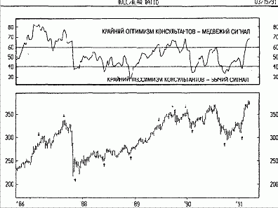 Высокие значения коэффициента быков/медведей предупреждают о понижении (на рынке слишком много быков), а низкие говорят о возможном повышении (быков недостаточно). Почти в каждом случае, когда коэффициент принимает экстремально высокие или низкие значения, рынок оказывается на вершине или в основании. Согласно историческим данным, значения коэффициента выше 60% указывают на крайний оптимизм и являются медвежьим сигналом. Значения ниже 40% говорят о крайнем пессимизме и служат бычьим сигналом.