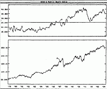 В точке А коэффициент коротких продаж публикой опустился ниже 25% и оказался на медвежьей территории. В течение следующих нескольких месяцев PSR продолжал опускаться по мере усиления бычьих настроений широкой публики. В этот период цены быстро росли, подогревая неистовство покупателей. Последовавший за этим крах 1987 года вернул публику к жестокой реальности.