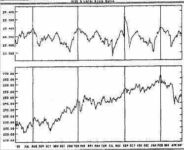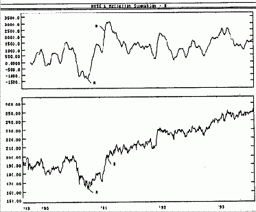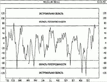 Я предпочитаю использовать не сами дневные значения индикатора, а его экспоненциальное скользящее среднее с периодом от 5 до 40 дней. Такое скользящее среднее служит превосходным краткосрочным индикатором перекупленности/перепроданности. Скользящие средние разности растущих и падающих акций используются также при расчете индикатора перекупленности/перепроданности и осциллятора Макклеллана.