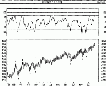 На следующем рисунке показаны графики DJIA и 40дневного скользящего среднего индикатора разности растущих и падающих акций. Я нанес стрелки «покупка» там, где скользящее среднее поднималось выше 50, а стрелки «продажа» там, где оно опускалось ниже 125. Обычно в качестве границ перекупленное™ и перепроданности я использую уровни ±100, но в данном случае сильная восходящая тенденция в течение всего периода привела к смещению графика индикатора вверх.