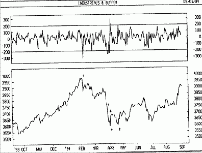 На следующем рисунке представлены графики промышленного индекса ДоуДжонса и индикатора разности растущего и падающего объема. Стрелками «покупка» на графике индекса отмечены моменты, когда индикатор поднимался выше 200, а стрелками «продажа» — когда он опускался ниже 200.
