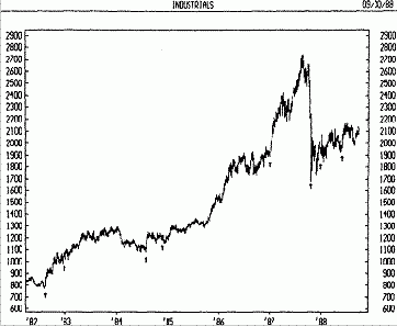 На следующем рисунке показан график промышленного индекса ДоуДжонса почти за весь период 80х. Стрелками «покупка» отмечены места возникновения двойных комбинаций «9 к 1».