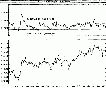 На следующем рисунке представлены графики индекса S&P 500 и 15дневного скользящего среднего коэффициента A/D. Как видно из примера, цены обычно падали после вхождения в область перекупленности — выше 1,25 (стрелки «продажа») — и возрастали после попадания в область перепроданное™ — ниже 0,90 (стрелки «покупка»).