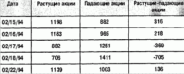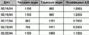 Данный индикатор показывает разность между числом выросших и числом упавших в цене акций. Его значения помогают определить силу рынка в данный день. В дни сильных подъемов индикатор обычно превышает +1000, а в очень слабые дни—опускается ниже -1000.