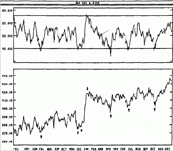 На следующем рисунке представлены графики индекса S&Р 500 и индикатора STIX. Стрелками «покупка» обозначены места, где STIX сначала опускался ниже, а затем поднимался выше уровня перепроданное™ 45. Стрелками «продажа» отмечены случаи, когда STIX сначала поднимался выше, а потом опускался ниже уровня перекупленности 56.