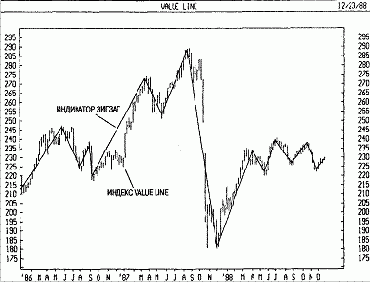 На следующем рисунке показан индикатор «зигзаг», нанесенный на график составного индекса Value Line Composite. Индикатор выявляет изменения индекса, составляющие не менее четырех процентов.