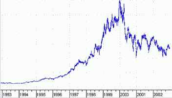 Как видите, Microsoft достиг абсолютного максимума в начале 2000 года и с тех пор упал до половины этой величины.