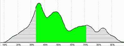 Затененная область представляет собой 60% всей области под графиком. Это означает, что в 60% случаев откат дает значения между 35% и 70%.