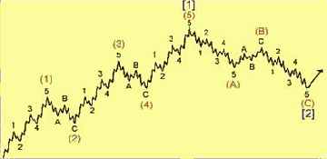 За этой коррекцией, Волна (2), следуют Волны (3), (4) и (5), комплектующие импульсную последовательность следующей, большей степени, помеченную, как Волна [1].