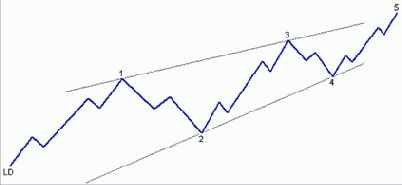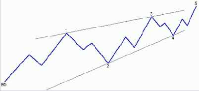 Диагональ - это движущий 5-волновой паттерн, помечаемый цифрами 1-2-3-4-5, который движется в сторону большего тренда. Диагонали ходят в пределах двух сужающихся линий канала, проведенных от волн 1 - 3 и от волн 2 - 4.