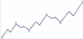 Как показывает график, эти основные паттерны связываются, чтобы образовать пяти- и трехволновые структуры все большего и большего размера (большей "степени" в терминологии Эллиотта).