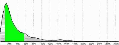 Здесь мы видим, что возможный диапазон отношения Волна 3/Волна 1 прогнозируется между приблизительно 50 % и 500 %. Однако, примерно в 60 % случаев отношение Wave 3/Wave 1 располагается от 110 % до 220 %. Все это дает нам вначале абсолютный диапазон для прогноза, а затем, уже в пределах этих величин, внутренний диапазон высокой вероятности - цель - "яблочко мишени", если хотите.