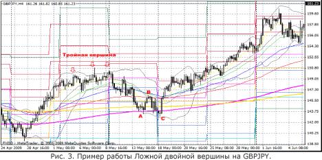 Конечно, рынок есть рынок, и модель иногда принимает всякие причудливые формы. Вот, к примеру, пара GBPJPY в мае этого года. Здесь просто тройная вершина, пробитая вниз.