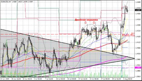 А вот евро в начале августа. Здесь почти два месяца пара консолидировалась после сильного роста. В результате консолидации сформировался треугольник, очень похожий на треугольник продолжения тенденции. И в июле его действительно пробили вверх, но сильно вверх не ушли, диапазон не пробили, сформировали ложную двойную вершину, скатившись к поддержке, которая образовалась у гипотенузы пробитого вверх треугольника и месячного пивот уровня.