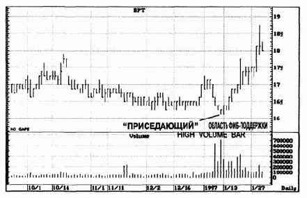 Недельный график бондов (Рисунок 6-18) идеальный пример этого феномена. Мы имеем сильную поддержку Фибоначчи ниже линии шеи. За периодом, во время которого трейдеры "понимают неправильно" (две-три недели), следует крутой подъем, захлопывающий ловушку для игроков, ориентирующихся на модели. Развитие событий на недельном графике может служить основой для торговли. А входить в рынок следовало, пользуясь дневной Временной Структурой.