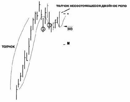Примечание: Этот сигнал один из немногих случаев, когда вы полностью разворачиваетесь в своей первоначальной позиции. Возможно и агрессивное вхождение в рынок (открытие новой позиции) на максимуме сигнального бара Несостоявшегося Двойного РеПо даже после самого небольшого отката. Дело в том, что этот сигнал — сигнал Направления. Не играйте с ним. Сойдите с его пути и следуйте за ним! На Рисунке 6-10 мы отчетливо видим Двойное РеПо, которое терпит неудачу, превышая на откате точку "*". Оказавшись на длинной стороне рынка, вы имеете два места выхода. Точка "СОР" (не показана) могла бы быть вашей расчетной точкой получения прибыли по Фибоначчи. Пересечение при закрытии в обратную сторону ниже 3x3 - ваш защитный ордер на выход из рынка. Этот защитный стоп способен принести вам прибыль или убыток в сделке в зависимости от того, когда и где цена пересекает 3x3. Еще вы можете использовать методы размещения стопов, обсуждаемые в ГЛАВАХ 8-11. Независимо от тактики, сигнал остается в силе, пока не достигнута существенная целевая Точка Разумной Прибыли, или вы не получаете Подтвержденный сигнал Тренда, направленный против ожидаемого курса Движения.