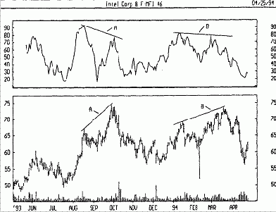 На следующем рисунке представлены графики курса акций Intel и 14дневного индекса денежных потоков. Расхождения в областях А и В послужили четкими опережающими сигналами разворотов цен.