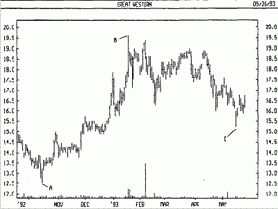 На следующем графике курса акций Great Western отмечены три точки —А, В и С. Точка А указывает начало ценового движения, В —его окончание, а С — окончание коррекции. В данном примере доля коррекции составила 61,5% исходного ценового движения.