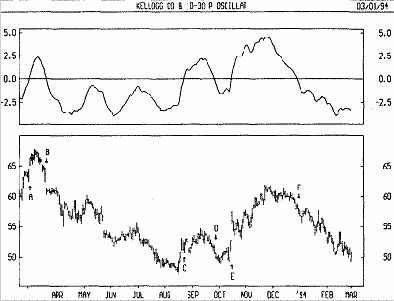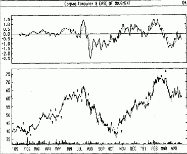На следующем рисунке показаны графики курса акций Compaq и 14дневного индикатора легкости движения вместе с его 9дневным скользящим средним. Стрелки «покупка» и «продажа» нанесены на график в местах, где скользящее среднее индикатора пересекает нулевой уровень.