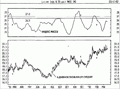 На следующем рисунке представлены графики курса акций Litton и индекса массы. На график курса акций также нанесено 9дневное экспоненциальное скользящее среднее. Стрелками отмечены моменты образования разворотного горба (когда кривая индекса массы сначала поднималась выше уровня 27, а затем опускалась ниже 26,5. Если при этом 9дневное скользящее среднее было направлено вниз, на графике ставились стрелки «покупка». В случае, когда скользящее среднее росло, поставлена стрелка «продажа».