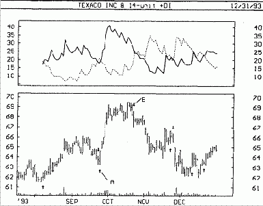 На следующем рисунке представлены графики курса акций Техасo и индикаторов +DI и DI. Стрелками «покупка» отмечены места, где +DI поднимается выше DI, а стрелками «продажа» — где +DI опускается ниже DI.