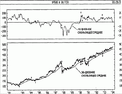 На следующем рисунке изображены графики индекса S&Р 500 и 1 дневного скользящего среднего индикатора NH-NL. Здесь индикатор NH-NL используется для подтверждения обычной системы торгов. на основе скользящего среднего. Стрелки «покупка» ставились та где индекс S&P 500 поднимался выше своего 50дневного скользящего среднего, но только если при этом и 10дневное скользящ среднее индикатора NH-NL находилось выше нуля. Стрелки «продажа» проставлены везде, где индекс S&Р 500 опускался ниже свое скользящего среднего.