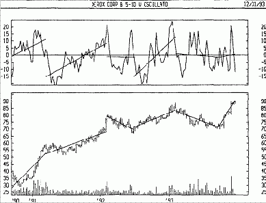 На следующем рисунке представлены графики курса акций Хегох и 5/ 10недельного осциллятора объема. На оба графика нанесены линии тренда линейной регрессии.