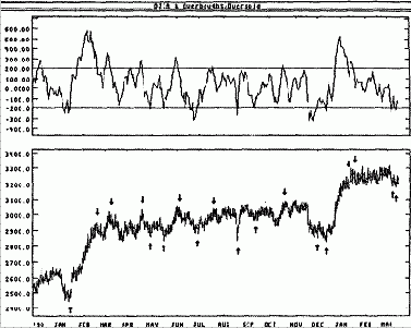 На следующем рисунке показаны графики индекса S&P 500 и кумулятивного индикатора разности новых максимумов и минимумов. Классическое расхождение возникло в 1985-1986 годах, когда индекс S&P 500 продолжал устойчиво расти, образуя новые максимумы, а индикатору не удавалось подняться выше своих предыдущих максимумов. За этим последовал обвал рынка акций в октябре 1987 года.