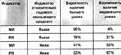 В своей книге «Логика фондового рынка» (In Stock Market Logic) Норман Фосбак указывает, что когда NVI поднимается выше своего годового скользящего среднего, вероятность бычьего рынка равна 95%. А когда NVI опускается ниже своего годового скользящего среднего, шансы бычьего рынка составляют примерно 50%. Таким образом, индекс отрицательного объема наиболее эффективен как индикатор бычьего рынка.