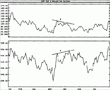 «Линия тренда на представленном ниже графике показывает, что растущий объем в среднем превышал падающий в течение всего 1983 года. Затем, в феврале 1984 года, эта восходящая линия тренда была прорвана, что стало подтверждением слабости рынка.