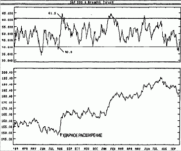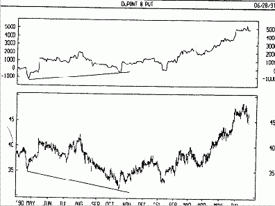 С момента прорыва вниз восходящей линии тренда CVI вновь пошел вверх (временами входя в горизонтальный коридор). В ходе продолжающегося падения рынка растущий объем превышал или равнялся падающему (CVI снова идет вверх). Это можно истолковать двояко. Часть инвесторов считает так: поскольку рынок не растет (хотя растущий объем опережает или, по крайней мере, идет вровень с падающим), следовательно предложение слишком велико. Если цены падают даже при большем растущем объеме, то что же произойдет, если падающий объем превысит растущий? Согласно другой точке зрения, CVI отражает действия профессионалов. А поскольку средства вкладываются в растущие бумаги, рынок неизбежно вскоре скорректирует расхождение и также пойдет вверх».