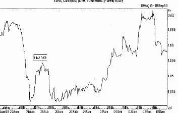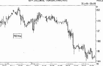 Примерно так и развивались события по британскому фунту в июне 1999 года, с той лишь разницей, что речь шла о понижении ставок. К этому времени Банк Англии (Bank of England, ВОЕ) уже несколько раз понижал процентные ставки и публично заявлял, что слишком высокий курс фунта является причиной снижений; деловой цикл в Англии находился в стадии снижения, как предполагалось, близи нижнего уровня, и по экономическим данным было видно, что слишком сильный фунт наносит ущерб британским экспортным отраслям. Кроме того, с начала 1999 года активно обсуждались перспективы вхождения Англии в Европейский Экономический и финансовый союз (Economic and Monetary Union, EMU); считалось, что оно должно состояться достаточно скоро, причем фунт должен войти в евро на уровне, существенно более низком, чем тот, где он торговался весной 1999 (помните 1992-й!). Поэтому давление на фунт книзу было сильным и длительным. Когда же ВОЕ 10 июня понизил свою ставку рефинансирования с 5,25% до 5,0%, то после короткого отката вниз внутри одного часа, фунт довольно энергично пошел вверх (Рис. 5.2.). Разумеется, потом все встало на свои места, тем более что рынок тогда ожидал повышения процентных ставок по доллару (которое и состоялось 2 июля), так что процентный дифференциал должен был измениться не в пользу фунта.
