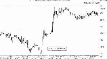 Поэтому когда позже в тот же день 21 сентября были опубликованы данные по иностранной торговле США за июль 1999 года и оказалось, что дефицит внешней торговли опять вырос до рекордной величины, реакция рынка была простой и однозначной - доллар быстро и сильно упал по отношению ко всем основным валютам. На рисунках 3.1 и 3.2 показаны графики, наглядно представляющие реакцию валютного рынка на эти данные.