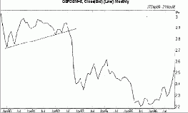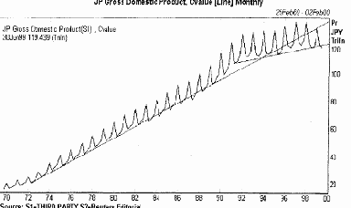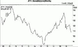 Известно, что в последние годы курс доллар/йена определялся большой разницей процентных ставок в Японии и США. Благодаря очень низким процентным ставкам в Японии, японские финансовые структуры имели возможность заимствовать большие объемы йены под очень малые проценты (ниже 0,5% годовых) и, конвертируя их в доллары, приобретать государственные ценные бумаги США, имеющие высокую доходность (более 5% годовых). Такие направленные на извлечение дохода операции привели к сильному снижению курса йены по отношению к доллару к середине 1998 года (до 147 йен за доллар см. Рис. 2.3.).