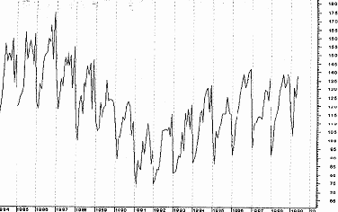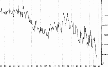 Но порой экономические факторы и настроение рынка сходятся воедино в такой степени, что публикация индикатора вызывает мгновенную и однозначную реакцию. К осени 1999 года отношение валютного рынка к американскому доллару было весьма напряженным: продолжавшиеся уже длительное время спекуляции о переоцененности американского рынка акций (который так и называли пузырем - bubble) и опасения его резкого падения, активный вывод японского капитала с американского финансового рынка, состоявшиеся летом два повышения процентных ставок FED и ожидание будущих повышений, все это особенно заострило внимание на еще одной постоянной проблеме - американском торговом дефиците, который опять же только недавно достиг нового рекордного уровня за всю историю США.