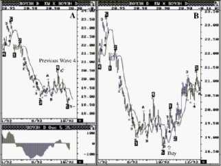 На графике А показан расчёт по Волне Эллиота, проведённый с помощью программного обеспечения. Последовательность из Пяти Волн завершается, к тому же, Осциллятор Эллиота демонстрирует благоприятную дивергенцию.