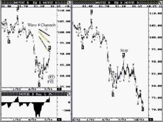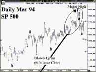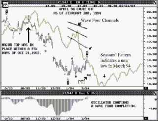 Примечание к графику: Цена на Сырую Нефть с апреля 94 до 3 февраля 1994Главный максимум был установлен в пределах нескольких дней около 21 октября 1993Сезонная Модель свидетельствует об установлении новой минимальной цены в марте 94.Осциллятор подтверждает завершение Четвёртой Волны.