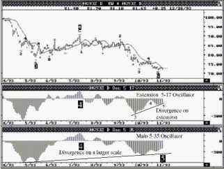 Осциллятор Эллиота изображает очевидную дивергенцию между пиками Третьей и Пятой Волн.