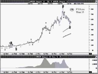 Когда цены, двигаясь вверх, делают пробел на третьей Волне; разница между короткой и длинной скользящими средними является большой и порождает большую величину осциллятора.