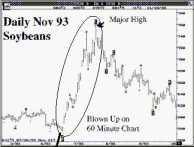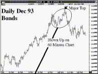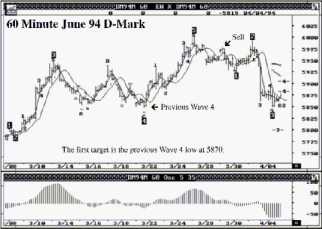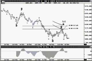 Примечание к графику:Цена на Сырую Нефть с апреля 94 до 28 декабря 1993Главный максимум сформировался в пределах нескольких дней около 21 октября 1993.Прогнозы ФибоначчиОсциллятор Эллиота должен вернуться к нулю, чтобы завершить Четвёртую Волну.