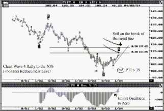 Продавайте на прорыве линии трендаОчевидный Подъём Четвёртой Волны на 50%Уровень Отката ФибоначчиОсциллятор Эллиота достигает нулевого уровня