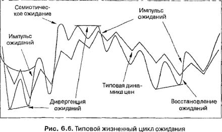 ожидания гораздо чаще наблюдается в случае с высокими значениями цен, нежели с низкими. Как было показано в модели семиотического ожидания, корреляция между ценой и ожиданием в периоды достижения рыночного «дна» и рыночного максимума носит совершенію разный характер. После падения цены до наименьшего уровня обязательно возникают ценовое стремление к росту и импульс ожиданий, в результате чего начинается подъем активности. На этой стадии ожидание растет быстрее цены, т. е. угол наклона кривой ожиданий оказывается больше. После нескольких незначительных пиков и спадов ожидания начинают отклоняться от цены: развивается самоуспокоенность. Тройное отклонение при наивысшем уровне цены — явление вполне привычное. После этого вновь начинается снижение цены: сначала происходит «медвежий» импульс, а затем кривая ожиданий вновь снижается быстрее кривой цен. В конце концов достигается новая низкая отметка, и цикл цекы/ожидания повторяется, или восстанавливается.