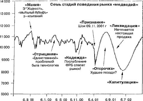 стадии рыночного поведения, демонстрирующая предполагаемую фазу рынка по состоянию па 28 сентября 2001 г. Данная диаграмма была показана к эфире CNBC и опубликована в газете «USA Today». Она показывает тело рынка, в данном случае представленное промышленным индексом Доу-Джонса. Психологические фазы определены в соответствии с настроением рынка. Кроме того, на диаграмме отражены преходящие инвестици-опиые идеи, или основы, представляющие собой компоненту сознание. Эти рыночные концепции (основы) представляют собой плоть, которая окружает скелет психологического паттерна. Таким образом, па диаграмме показаны все три составляющие вместе и в действии.