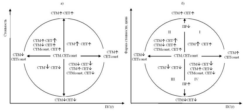 Рисунок 6, а воспроизводит циферблат кривой СЕТ, который рассматривался ранее (Рисунок 4). На графике отражены все возможные расположения кривой СЕТ и ее направленность при той или иной комбинации факторов товара – стоимости товарной массы, стоимости единицы товара, потребительной стоимости и производительной силы общественного труда.